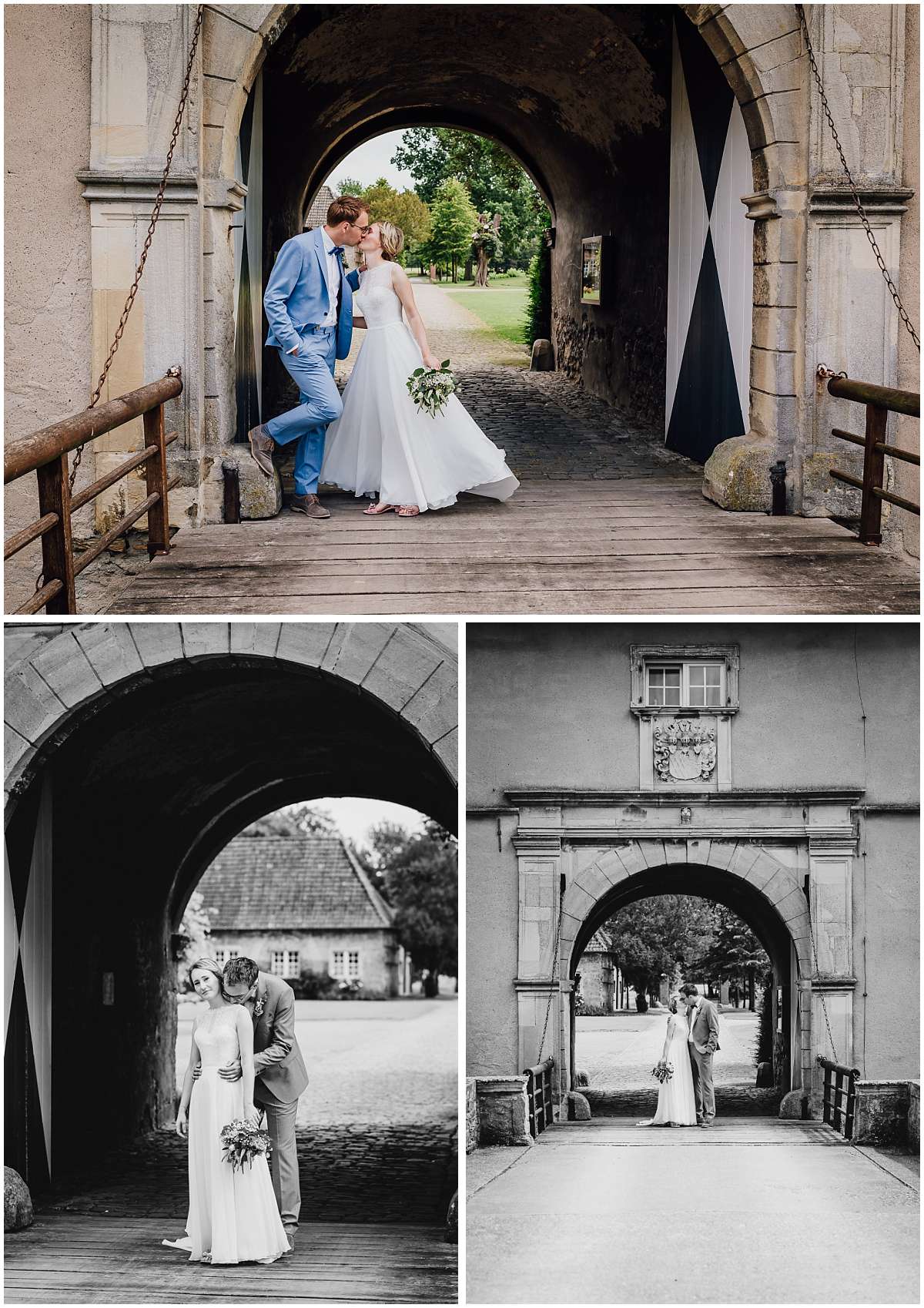 Vor der freien Trauung haben wir ein Brautpaarshooting auf Schloss Westerwinkel in Ascheberg gemacht. Während wir dort die Paarfotos gemacht haben, war es tatsächlich überwiegend sonnig, so dass wir uns aufgrund der hoch am Himmel stehenden Sonne eher möglichst schattige Plätzchen für die Bilder ausgesucht haben, im Schatten der Schlossmauern oder unter Bäumen. Sind die Outfits von Vici und Simon nicht toll? Ich mochte den Look der beiden sehr – das ärmellose Brautkleid mit Spitzenoberteil und langem, fließendem Rock stand Vici ganz wunderbar, und Simon sah in seinem hellblauen Anzug ebenfalls fantastisch aus.