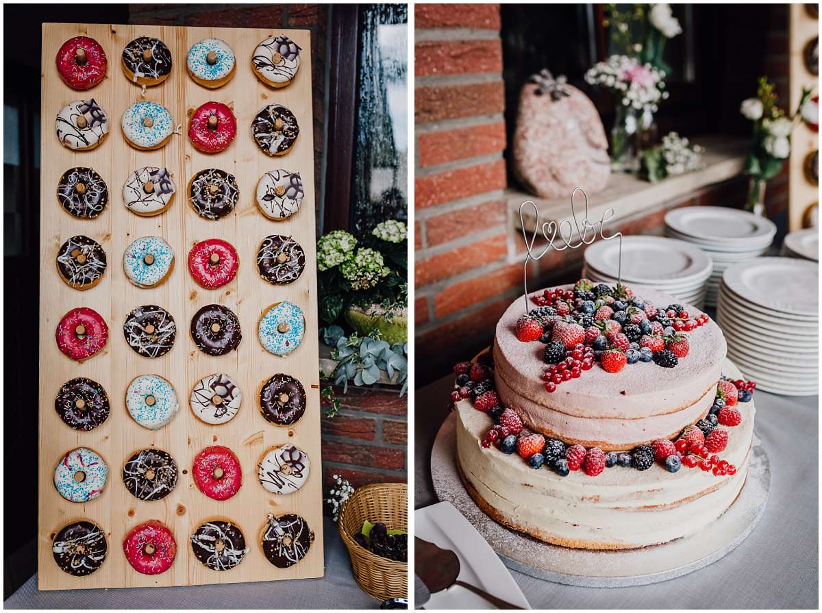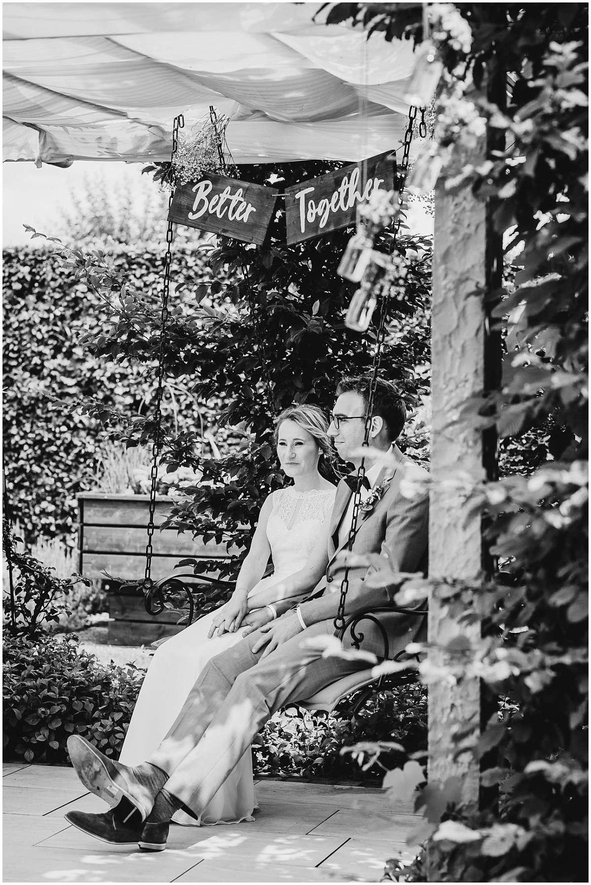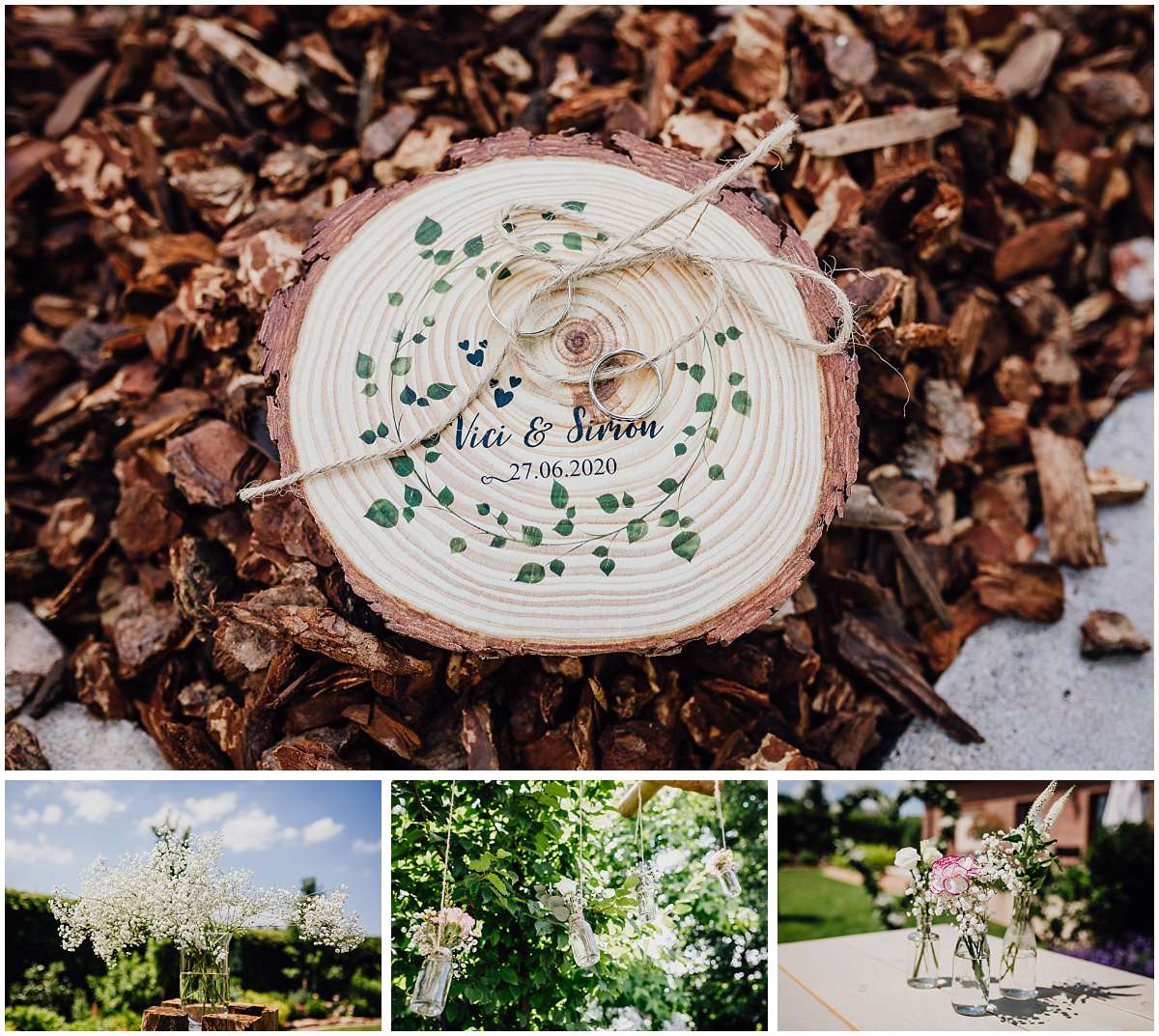 Als wir vom Brautpaarshooting am Schloss Westerwinkel zurückkamen, machte sich Vici erst einmal frisch, und ich konnte mir ein Bild vom Ort der freien Trauung machen. Ich muss sagen, ich war begeistert von dem wunderschön hergerichteten Garten und den liebevoll arrangierten Details bei der Dekoration der Gartenhochzeit – ein Träumchen! Die freie Trauung haben Vici und Simon in die Hände von Traurednerin Verena gegeben, die ganz wunderbare Worte gefunden hat, um auf eine herzliche und lustige Art die Geschichte der beiden zu erzählen. Die Trauzeremonie war wirklich sehr emotional, wozu auch das gegenseitige, tränenreiche Trauversprechen von Vici und Simon beigetragen hat (da musste ich sogar hinter der Kamera ein paar Tränchen verdrücken). Zudem hat ein Musiker-Duo mit Gesang und Gitarre, Alina und David, die Trauung musikalisch mit Lieblingssongs des Brautpaares untermalt.