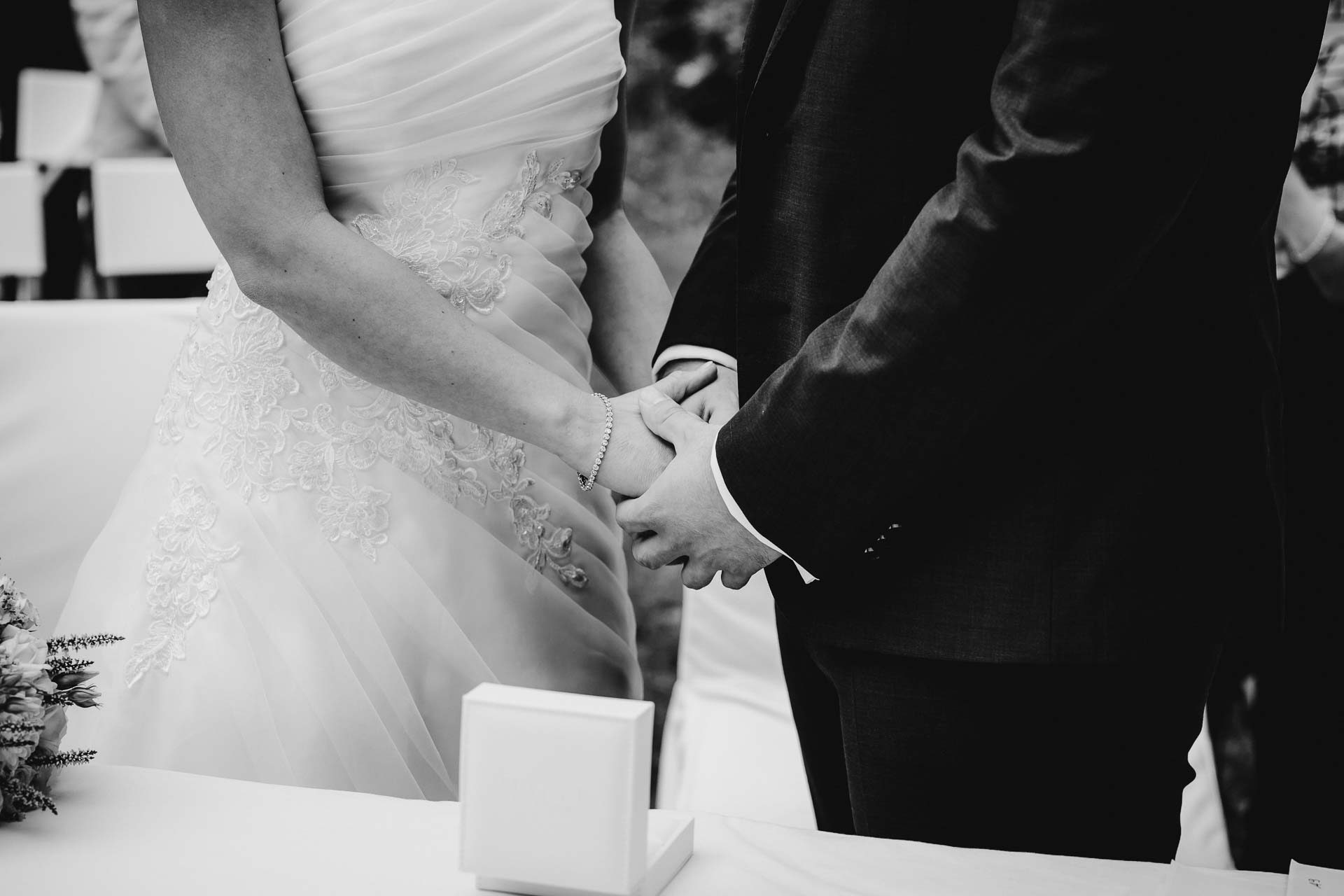 Katharinas Vater führte seine Tochter freudestrahlend zu Oliver, der bereits auf die Ankunft seiner Braut wartete. Für eine berührende Stimmung beim Einzug und im weiteren Verlauf der Trauung sorgte eine ganz tolle Sängerin, Denise Gehring. Ich finde es immer klasse, wenn Live-Gesang die Zeremonie begleitet - da bekomme sogar ich während des Fotografierens mega Gänsehaut. Die Trauung war insgesamt einfach wundervoll - Björn, der Trauredner, der das Paar ganz gut kannte, fand so schöne Worte und sorgte mit seiner lockeren, sympathischen Art für eine entspannte und sehr persönliche Atmosphäre. Es wurde gelacht, und es wurde geweint - für mich der Inbegriff einer perfekten Trauung. Noch mehr Emotionen kamen auf, als Katharina und Oliver sich vor dem Ringtausch ihr gegenseitiges Versprechen gaben. Bei diesen bewegenden Worten blieb vermutlich kein Auge trocken - auch nicht meins. (Neeeeiiiin, ich bin gar nicht nah am Wasser gebaut.)