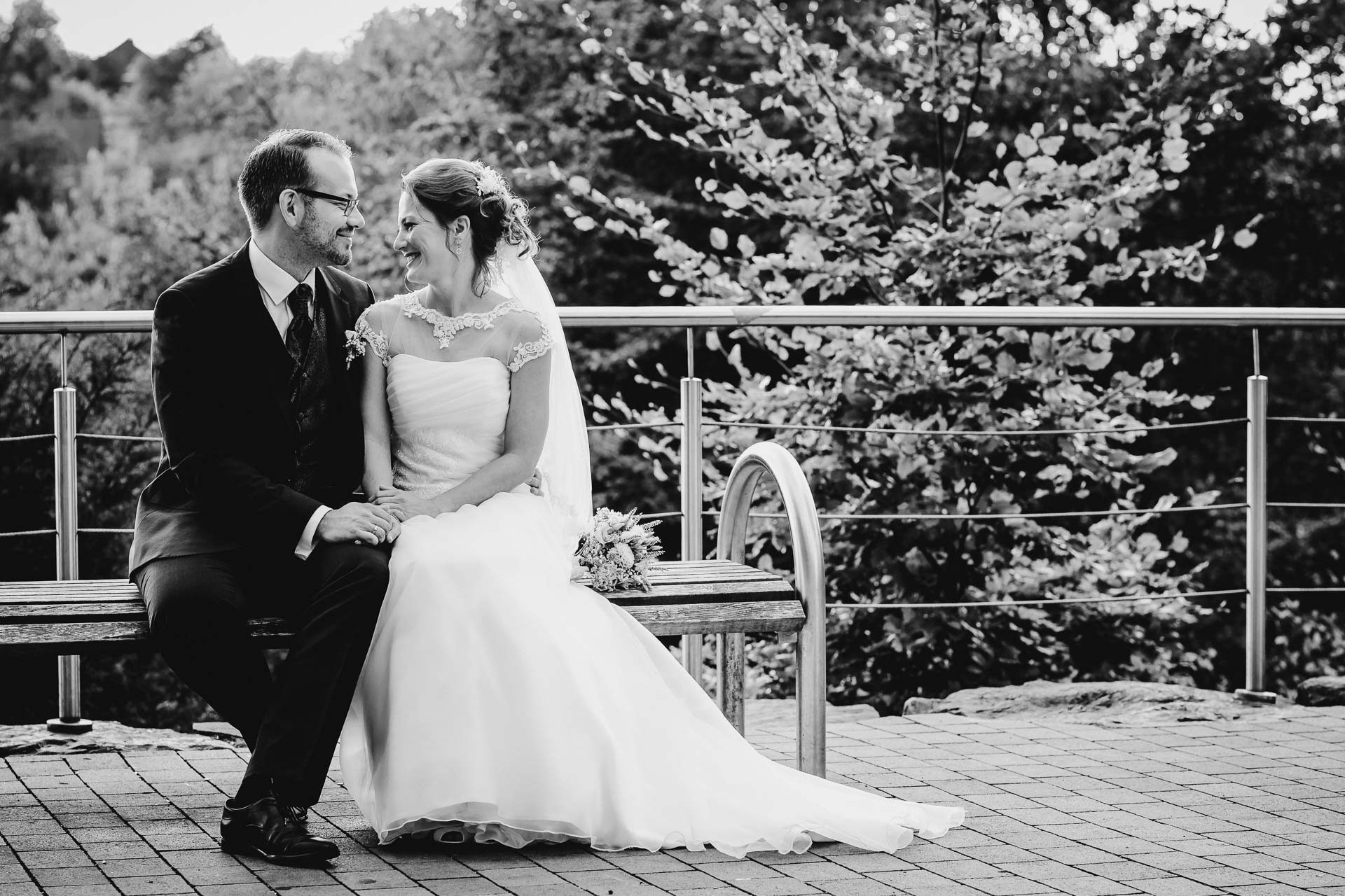 Am 15. September habe ich als Hochzeitsfotografin in Velbert die freie Trauung von Katharina und Oliver begleitet. Die Trauzeremonie sollte unter freiem Himmel im Garten des Parkhotels Velbert stattfinden, und vor der Trauung haben alle Beteiligten mächtig gezittert, ob das Wetter eine Trauung draußen auf der Terrasse zulässt. Der Himmel war grau und wolkenverhangen, und ab und an tröpfelte es sogar etwas, während wir uns auf die bevorstehende Trauung vorbereiteten. Katharina und Oliver hielten aber tapfer an ihren Plänen fest, weil sie sich eine Trauung unter freiem Himmel so sehr gewünscht hatten. Ihr Mut wurde belohnt, und es blieb trocken - mitten in der Trauung ließ sich sogar die Sonne blicken.