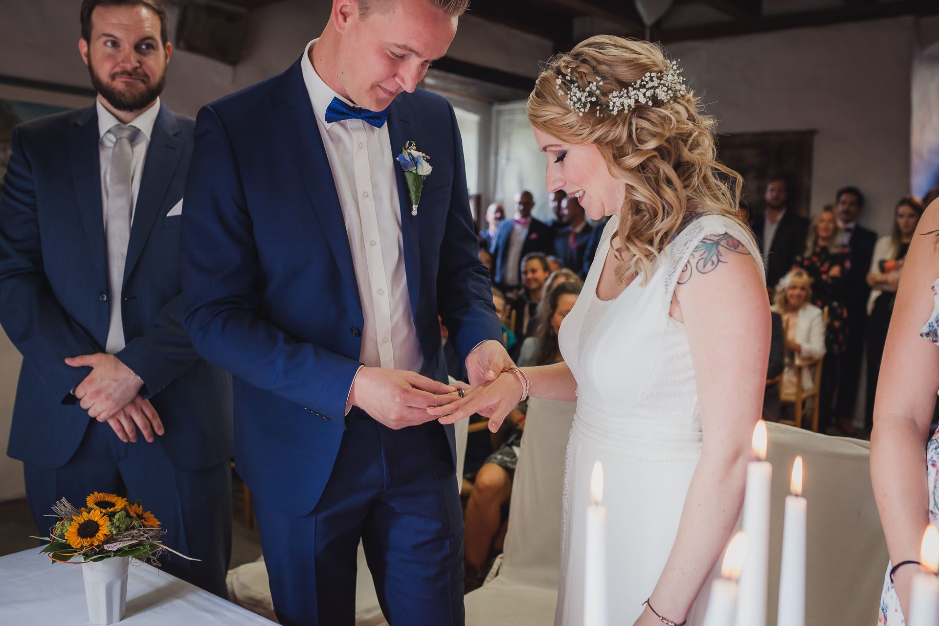Am 23.09.2017 habe ich Susans und Björns standesamtliche Hochzeit im Haus Herbede in Witten begleitet. Am Tag zuvor war Herbstanfang, und der Herbst zeigte sich an diesem Tag von seiner besten Seite. Die Sonne schien, und es herrschten spätsommerliche Temperaturen, so dass Susan in ihrem wunderschönen Kleid nicht frieren musste. Die Trauung fand im Haus Herbede in Witten statt, und gefeiert wurde anschließend im Landhaus Grum in Hattingen. Das mittelalterliche Rittergut "Haus Herbede" ist das älteste Herrenhaus im mittleren Ruhrtal und unweit des Kemnader Sees gelegen.